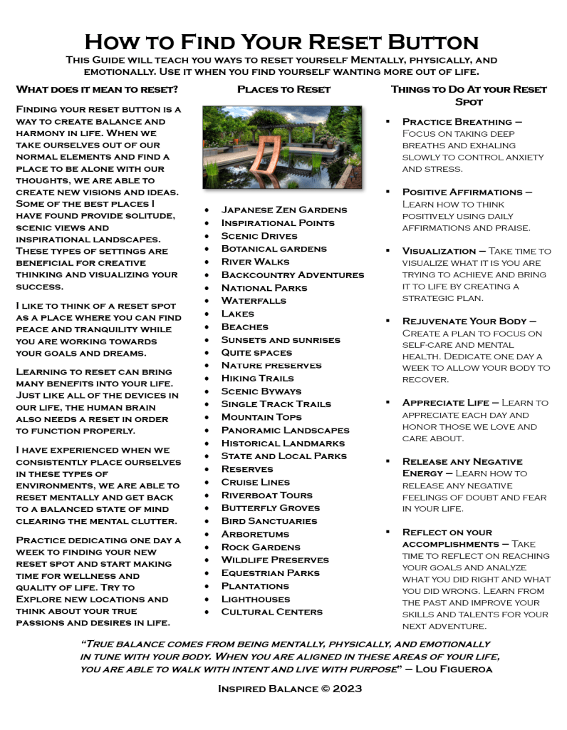 To order a laminated version of the reset guide for seminars and conferences send an email to Lou@InspiredBalance.org for more information.